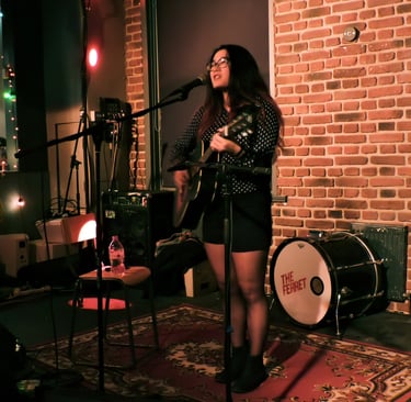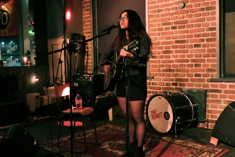 Eileen studied abroad in England her junior year. She skipped many classes and traveled to many countries, collecting postcards and memories that she'll take with her in her heart and in her music. She became a regular performer at the open mic at The Ferret, a local pub, and started hosting open mic nights there herself. That year, she also joined the drama club and made many new friends who encouraged her to keep going. At their encouragement and support, from the theatre to the open mics, she decided to drop everything she knew of her life until then and jump into pursuing theatre and music.